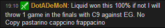 Team C9 without Demon :(The match that everyone was waiting for has finally arrived. A best of 5 finals between C9 and EG with everything on the line - to Fear never having won a LAN ever before - as pointed out by Demon in the pre-game interview to Arteezy's 100% LAN win rate on stake and Demon, the ultimate stand-in trying to beat his former team and helping C9 win their second LAN without Bone7 and his visa issues.