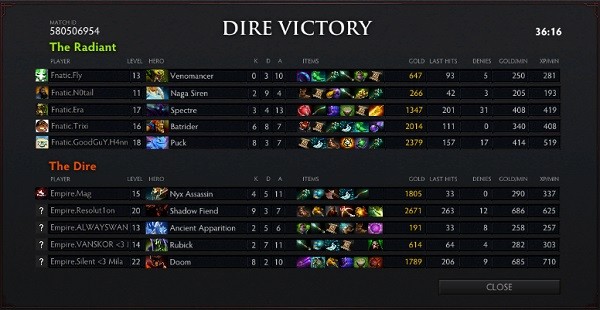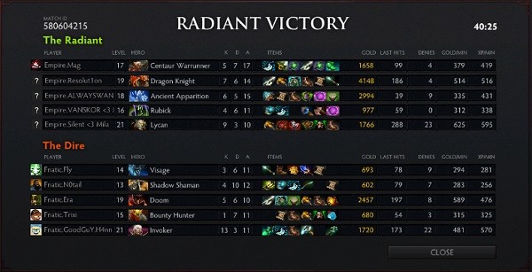 Empire had the slight lead in both gold and experience as well as a bit more farm on their core heroes, but