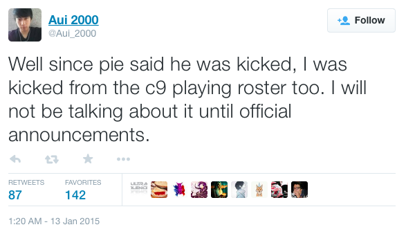 The "kicking" of both players seems unlikely to be performance related given that Aui_2000 is widely considered to be one of the best supports in the world, and PieLieDie is known for being a solid and consistent player. During their time in Cloud9 the team qualified for most major events and aside from a shaky couple of months last summer, finished in the top 3 in almost every tournament they participated in.