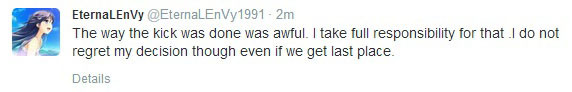 After PLD and Aui_2000 voiced publically they had been kicked from the team, EternalEnvy posted on Twitter confirming the fact and also added his own thoughts. "The way the kick was done was awful. I take full responsibility for that. I do not regret my decision even if we get last place." The Cloud9 captain then added "Still, as I mentioned earlier, I will not be giving my reasons to why the kick was done."
