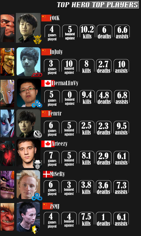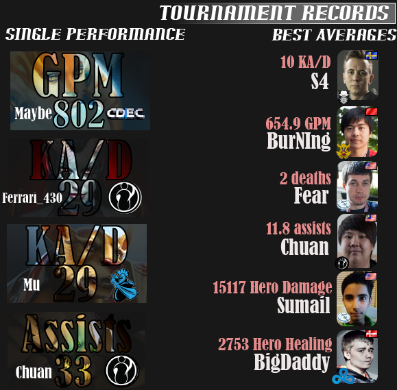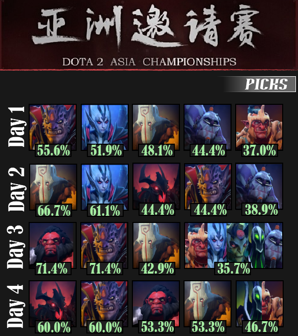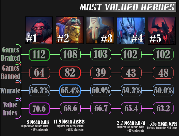 The maximum score on this scale is 100, and it is the equivalent of being drafted into and winning every single game. A 75 is the equivalent of being banned every game or being drafted every game and winning 50%. A 50 is the same as being drafted every game and losing every game or being drafted to the winning team 50% of the time. You get the idea. The following heroes were the DAC's most highly valued heroes according to this method--there is no accolade for Juggernaut because, quite honestly, I couldn't find anything that Juggernaut did the best (or even very close to the best). He was nearish to the top in about everything relevant, but did not outplay his peers in any particular category that I could find.