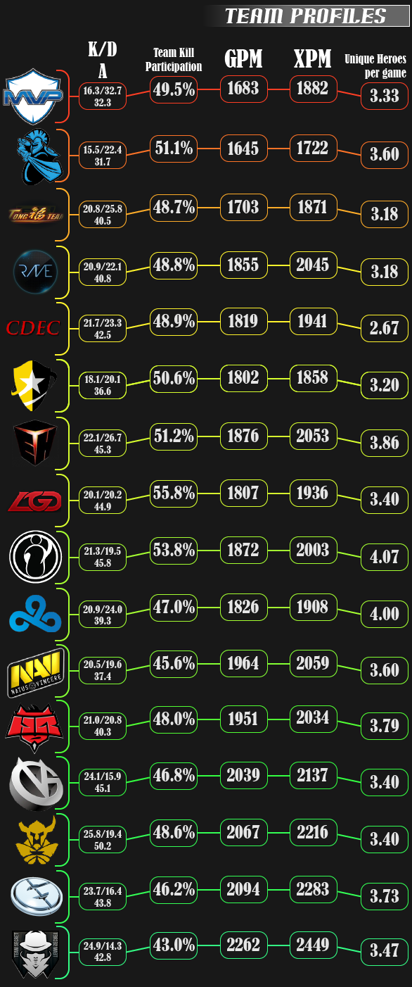 The following image uses two measurements that I might need to define. Unique heroes per game is simply the total number of heroes drafted over the course of the group stage divided by the number of games played. Team kill participation is the number of kills multiplied by four and divided by the number of assists. In other words, if every player participated in every kill his team made, team participation would be 1 (or 100%). Most teams land between a 40% and a 55% in team kill partipation historically.
