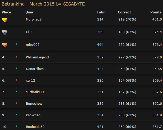 March was filled with qualifiers, from the nail bitingly close to the outright stomps. Cheese was lost at the cost of unlikely victors taking down big names. With last month's betting winner dropping down to 31st, MorpheoS, who secured second place in February's contest, takes home the generous prize.