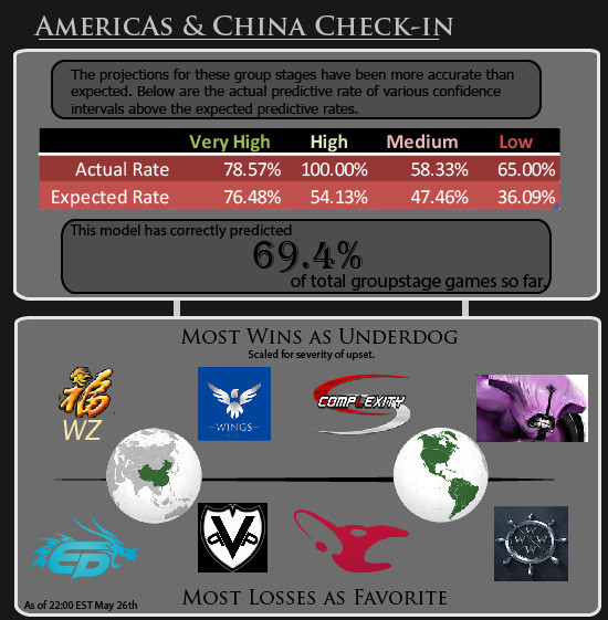 Postscript: Note that because each match has three potential outcomes (2-0, 1-1, 0-2), if the most likely outcome is below 39% likely, it must have less than a 9% projective advantage over all other options. That is a small margin of success, and we'd expect a lot of "upsets" in these matches which are really too close to call with confidence. That being said, nearly 66% of these low-odds games were correctly predicted in the previous groupstages.