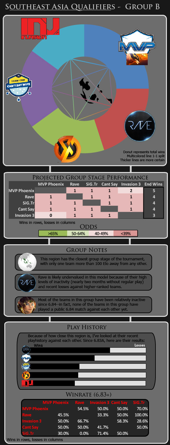 Unfortunately, SEA has some tournaments for which data is not automatically tracked at Datdota, my primary resource, so the SEA odds are the best with available data. There may be a couple of dozen games played which are not represented by these models. Models can only be built with the best data available.