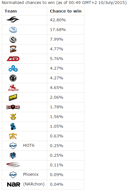 I'm defining the favored team as the team with the highest Elo. Elo is the ranking system used in Chess. Basically, teams earn points based on how often they win and against whom. In Dota, Elo correctly projects over 85% of games but only 21% of tournament winners. For this article we are looking only at the single team statistically most likely to win, not an array of teams each of which is likely to place well. Only one team can win and only one team can be a true "favorite".