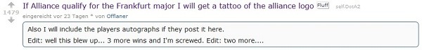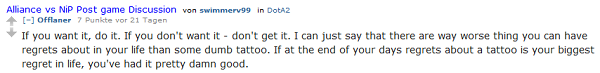 A picture of his new tattoo.There of course is the slim possibilty of all this being a PR stunt by Alliance, but after checking "Offlaner"'s comment-history on Reddit, this seems highly unlikely. By the nature of such an online bet, he also received a lot of criticism on his decision to get this tattoo, but his answer to critics is rather interesting.