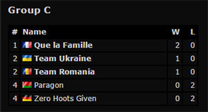 Paragon*, with Team Ukraine disposing of Zero Hoots Given in just 16 minutes in their game courtesy of Artstyle Chen creep pushes. What to expect Day 2: Group C is a three horse race and with Team Ukraine, Team Romania and Que la Famille all undefeated thus far, it is the most interesting contest of the four groups. Any of the matches between the 3 teams will be worth tuning in for tomorrow, but if I had to pick one it would be Que le Famille against Team Romania.
