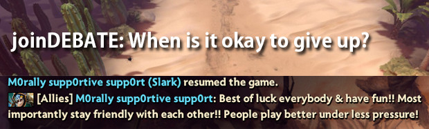 In the past when the joinDOTA League was going on - it's coming back soon please no more PMs - I formed a team with our staff. One of the staff members was a 5K MMR+ player who was always keen for us to give up and move on to the next game whenever he decided we were in a losing position. However, the lower MMR players in the group were generally more keen to never give up and never surrender because there still might be a chance to turn it around.