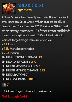 solar crest = 12 armor and 25% miss item, with 7 armor and 20% ingredients (no recipe). too much value perhaps needs a recipe cost.— Damien Chok (@kpiidota) April 30, 2017