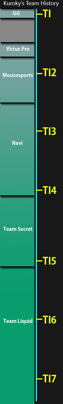 Clement 'Puppey' Ivanov who played alongside him as a stand-in for Mousesports, and the duo would later be reunited at Navi, forming the most recognisable TI roster in Dota 2 history outside possibly TI3's Alliance or TI5's EG. Kuroky played for GosuGamers at TI1 before then taking a break from competitive play for about 8 months. He then reappeared as a sub for Mousesports at TI2 after ComeWithMe was unable to attend, and later joined the team officially until he moved to Navi in February 2013.
