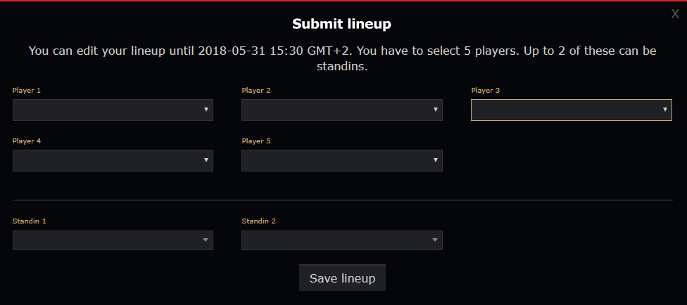 Select their names in the drop down list (only players with linked Steam accounts will be selectable). If you need to have any stand ins, you can select them below the core roster.